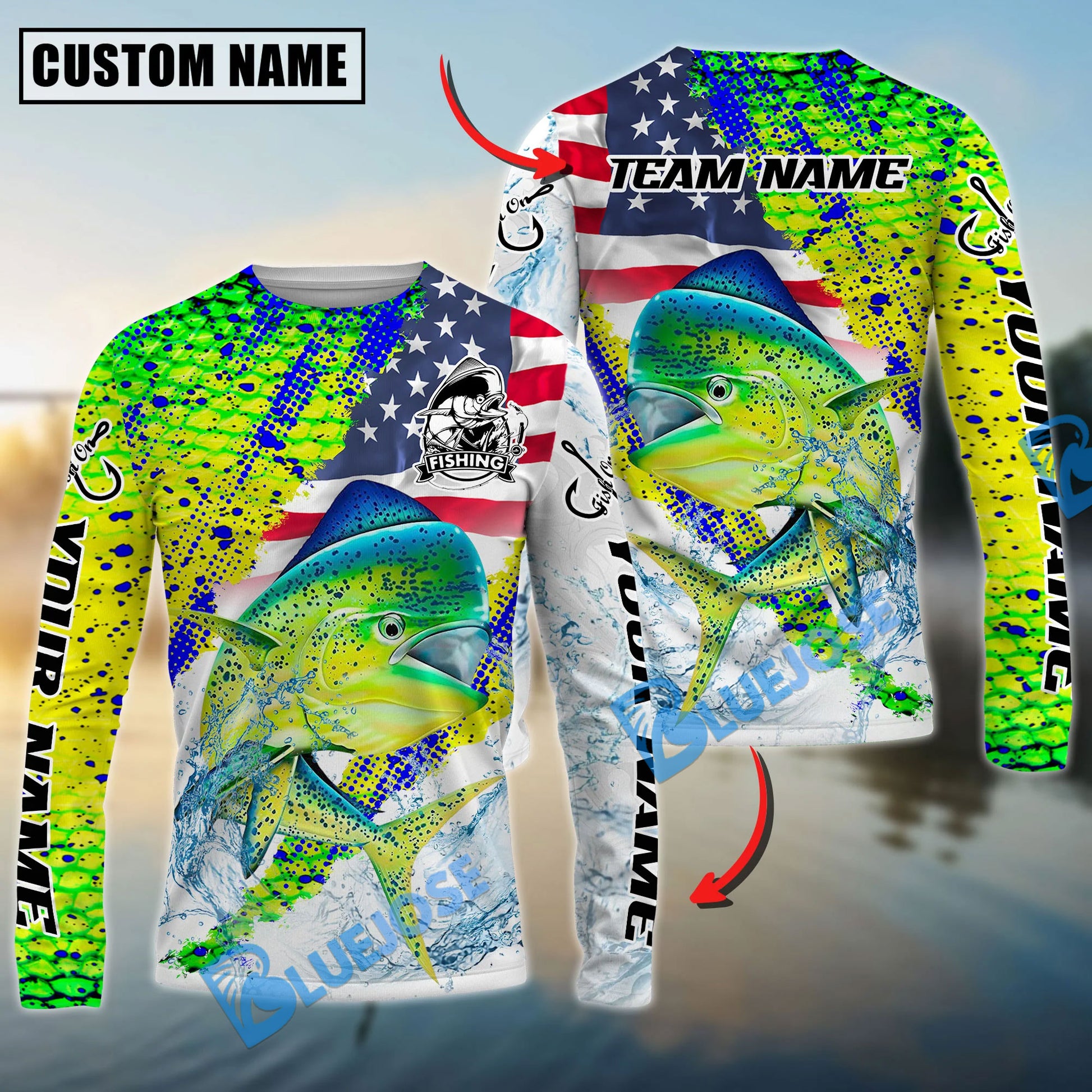 Bluejose Mahi-Mahi Fishing Skin Patriotic Water Splash Custom Name & Team Name 3D Shirts