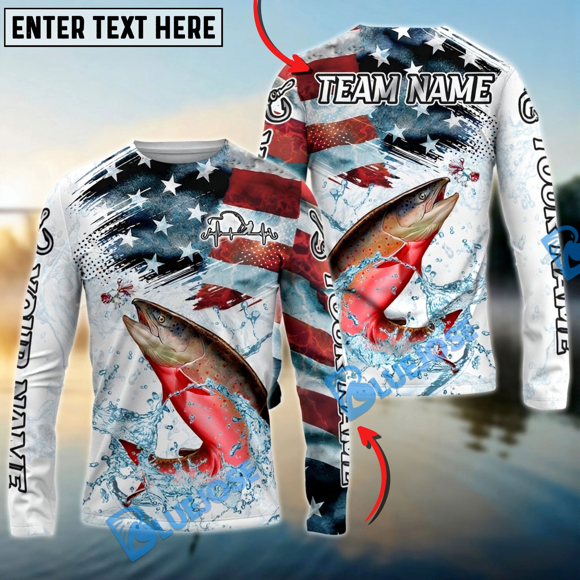 Bluejose Salmon Fishing Patriotic Water Splash Theme Custom Name & Team Name 3D Shirts