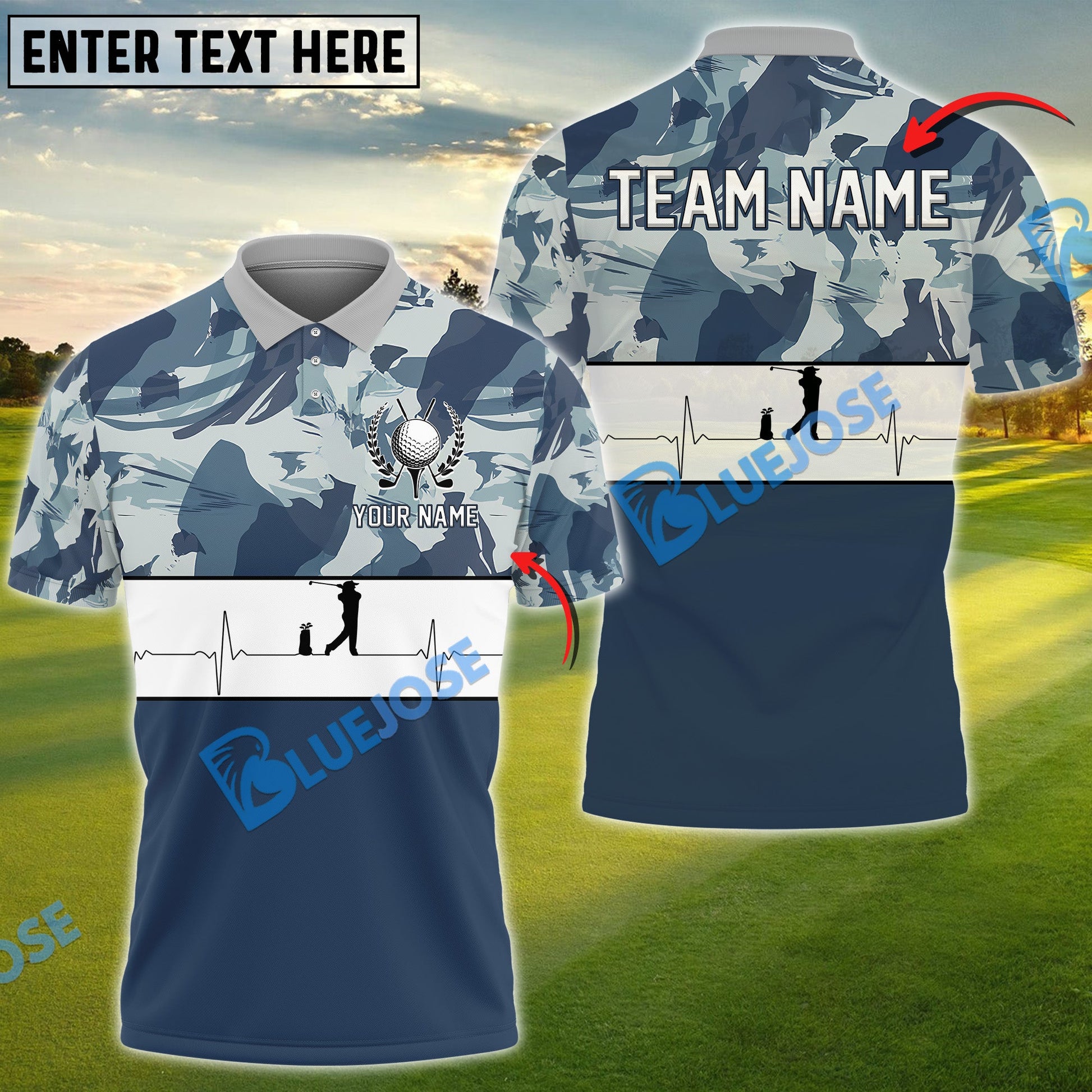 BlueJose Golf Polo Shirt with Camo Print and Heartbeat Customized Name, Team Name 3D Shirts (4 Colors)