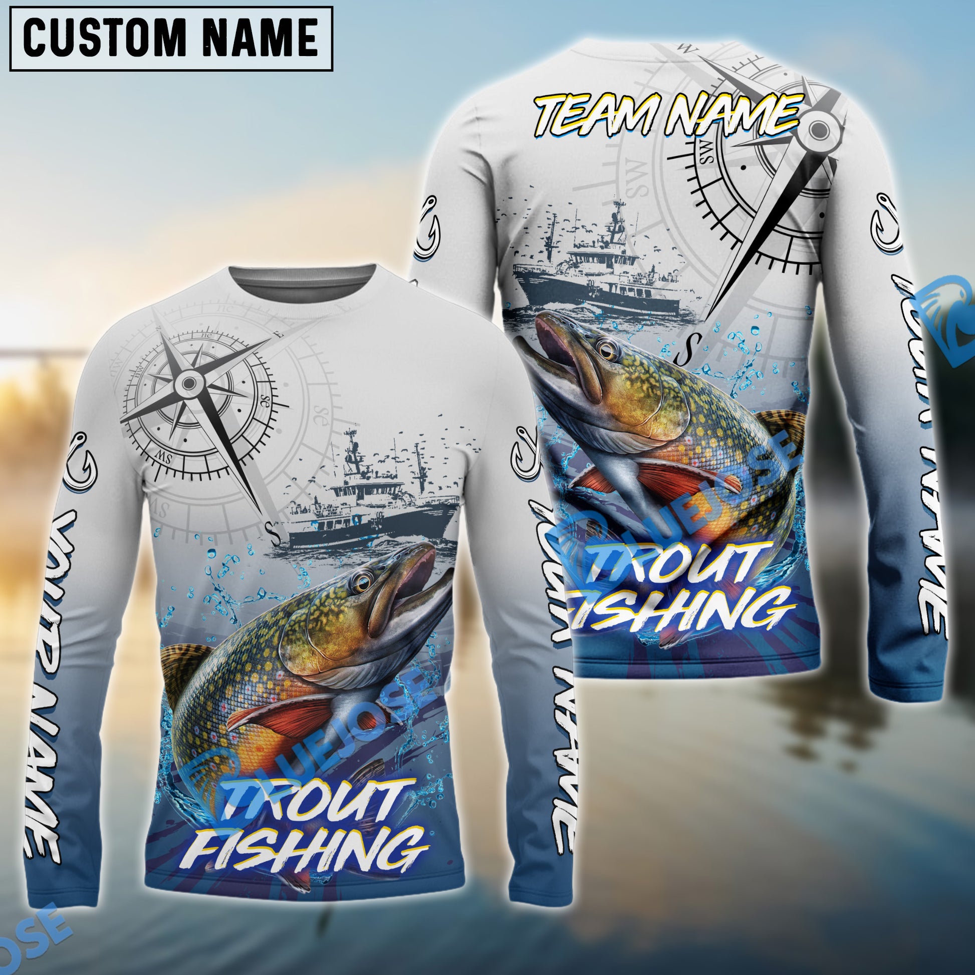 Bluejose Trout Fishing Realistic Fish Compass Anchor Pattern Custom Name & Team Name 3D Shirts
