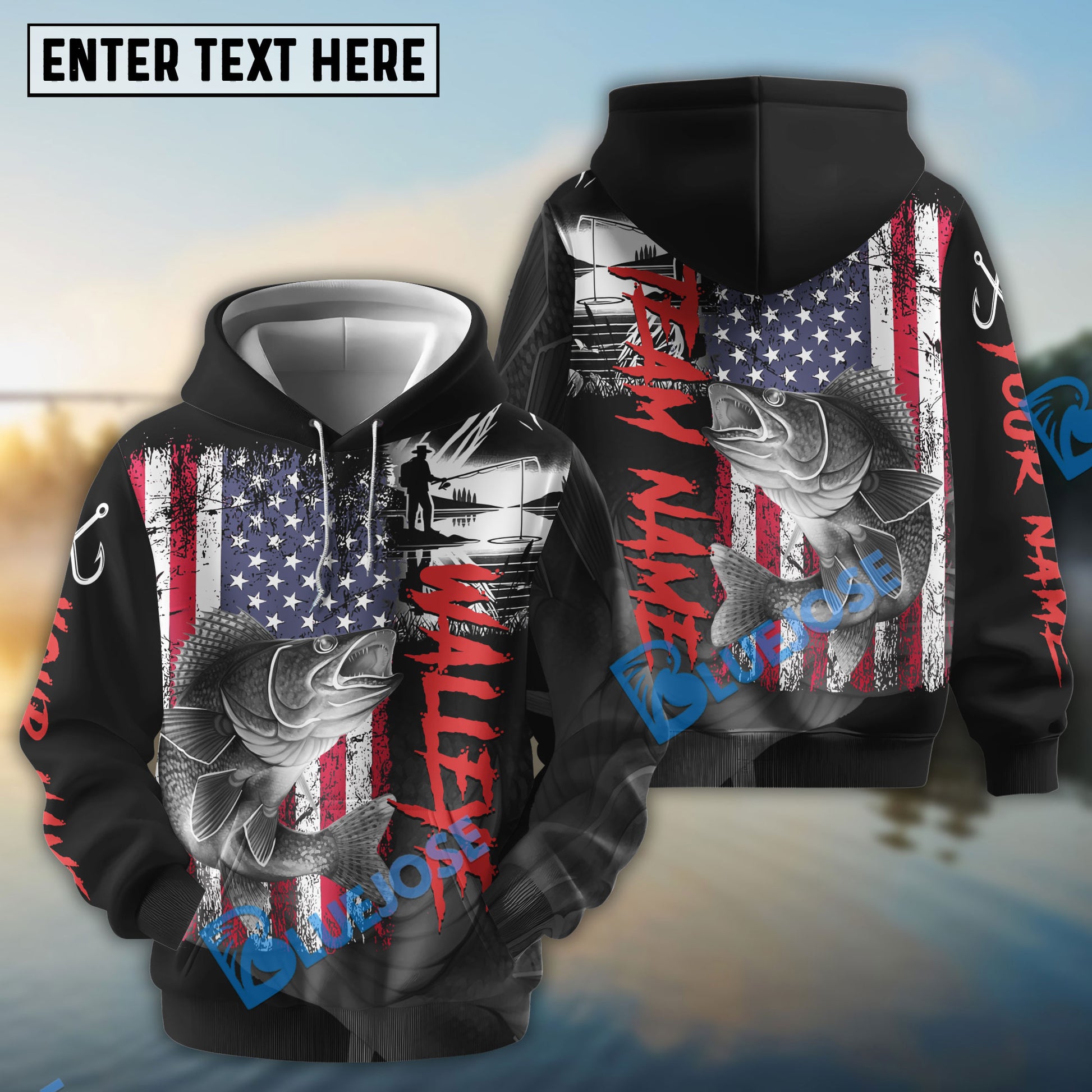 Bluejose Walleye Fishing Black US Flag Sport Custom Name & Team Name 3D Shirts
