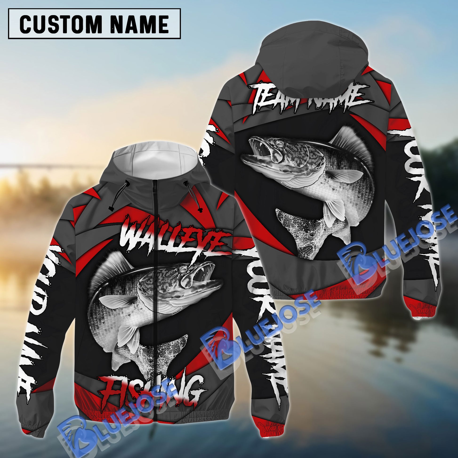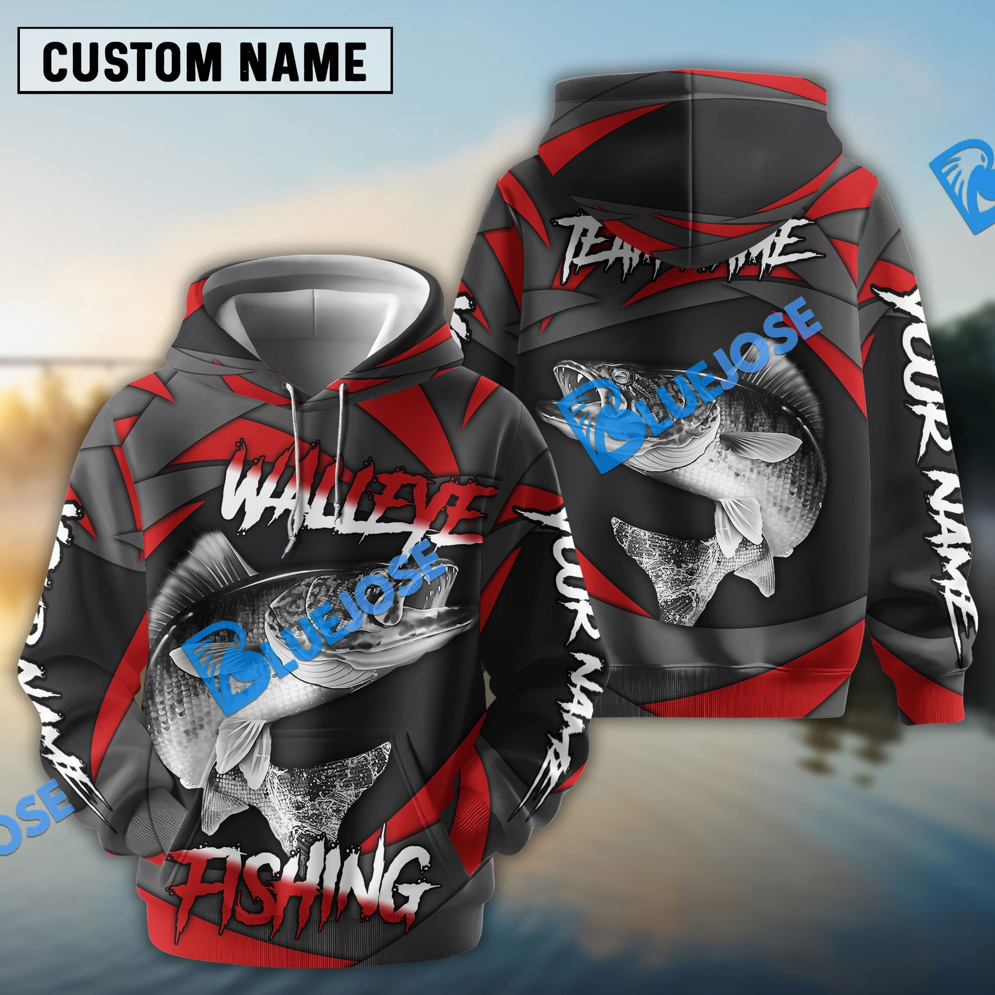 Bluejose Walleye Fishing Red Gray Spinning Pattern Custom Name & Team Name 3D Shirts