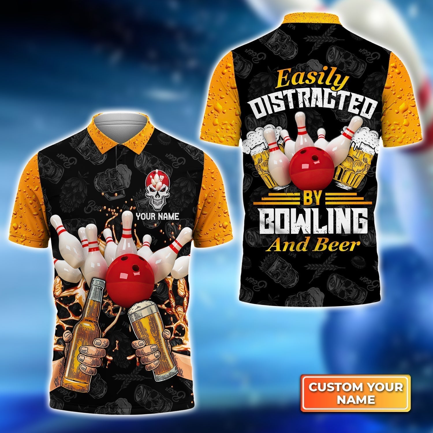 BlueJose Easily Distracted By Bowling And Beer Customized Name 3D Shirt, Personalized Shirts For Bowling Players