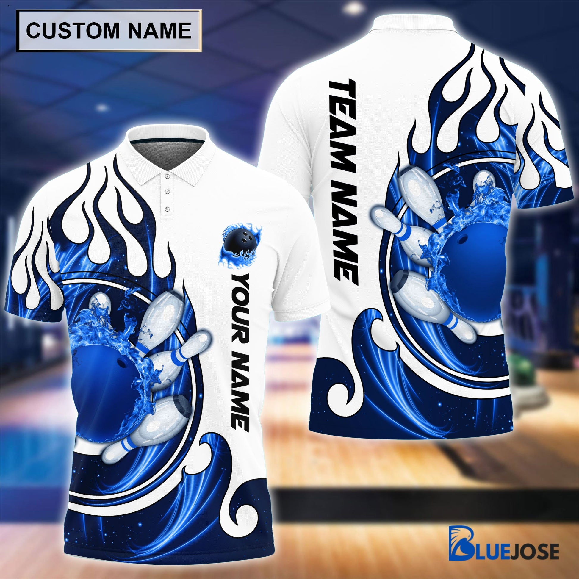 BlueJose Personalized Name and Team Name Fire Color Bowling Player Multicolor Polo Shirt