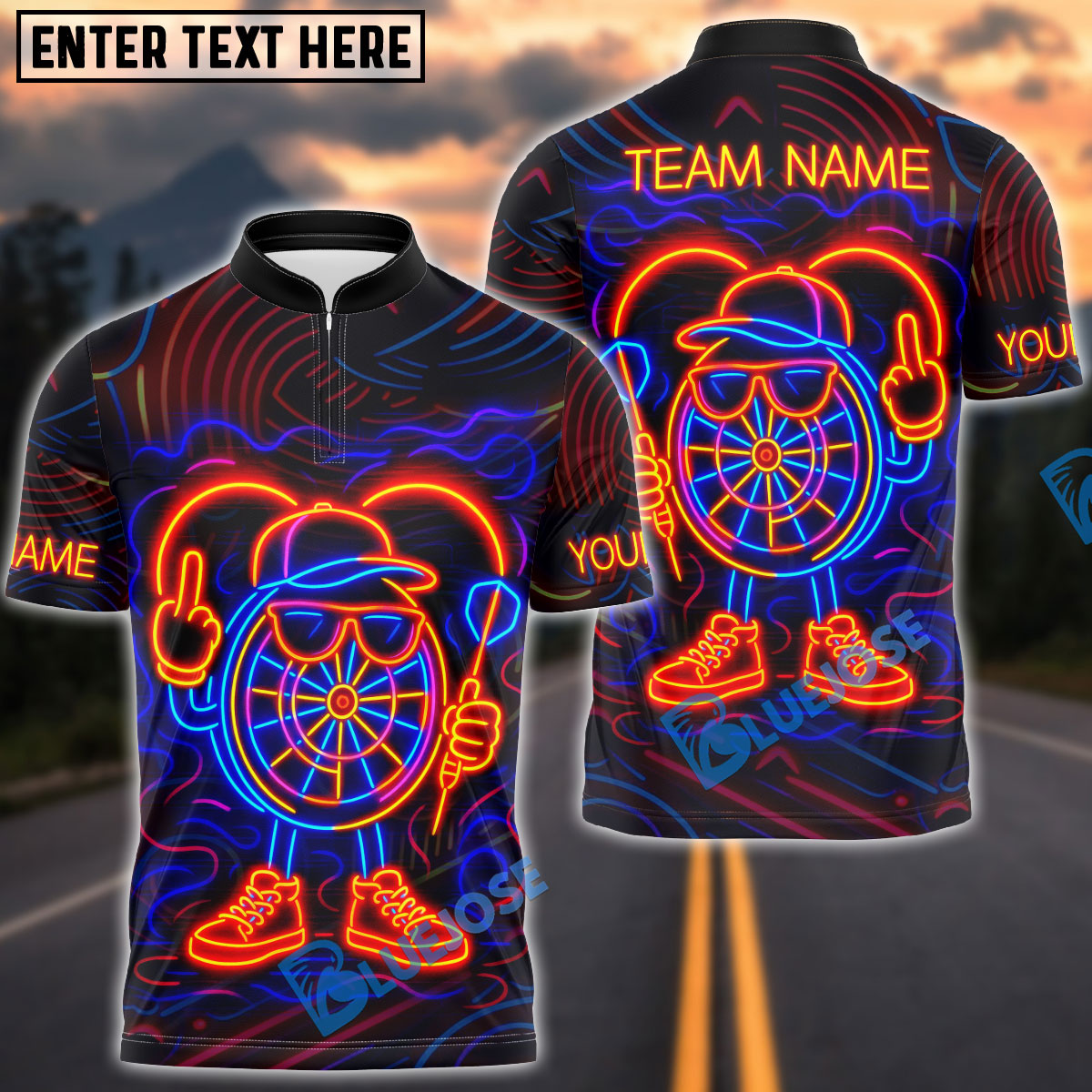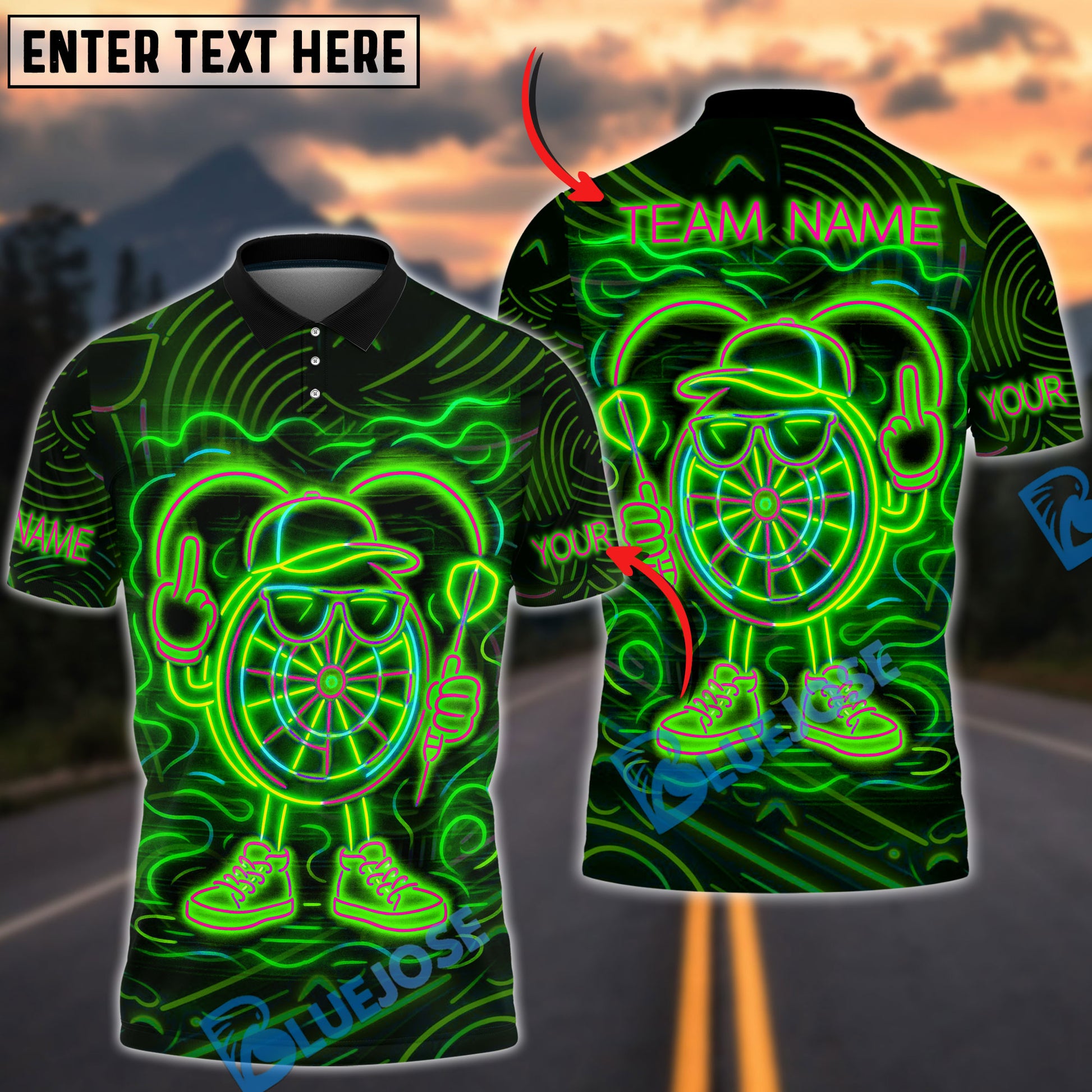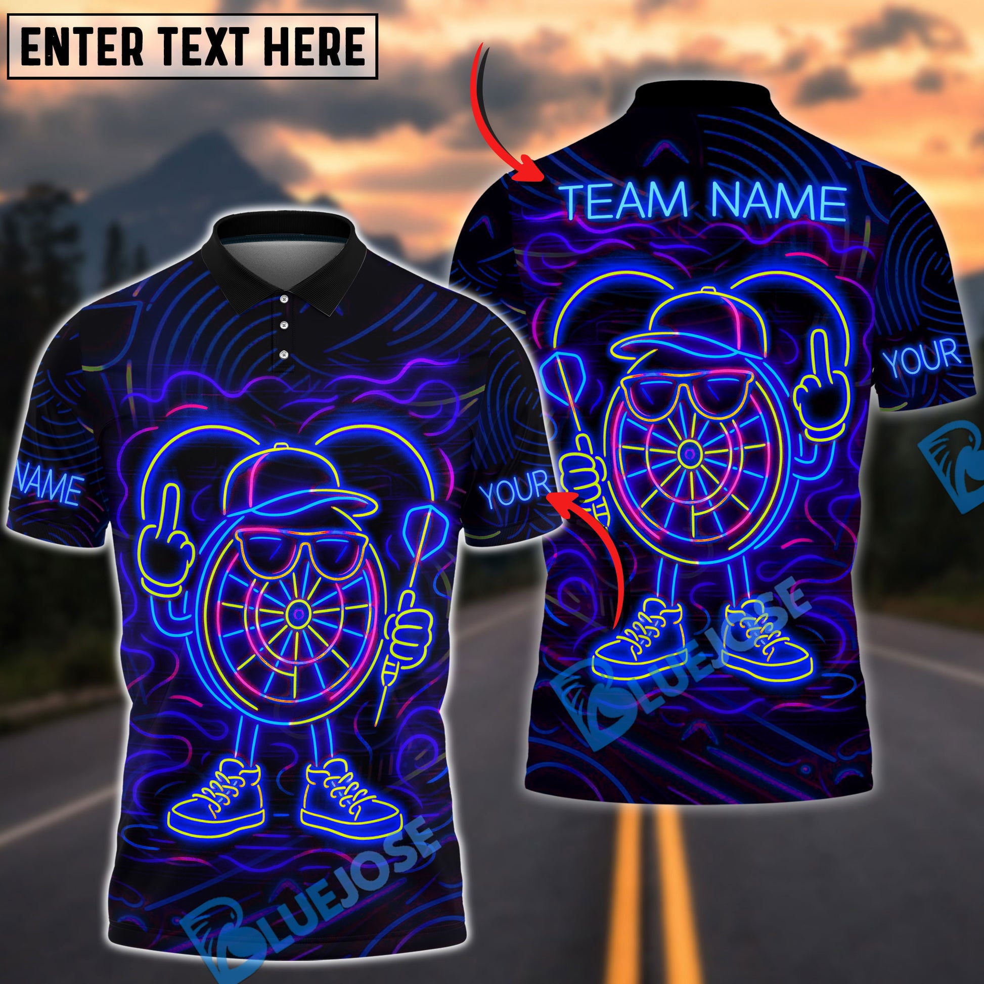 BlueJose Darts Neon Dartboard Champion Personalized Name, Team Name Shirt (4 Colors)